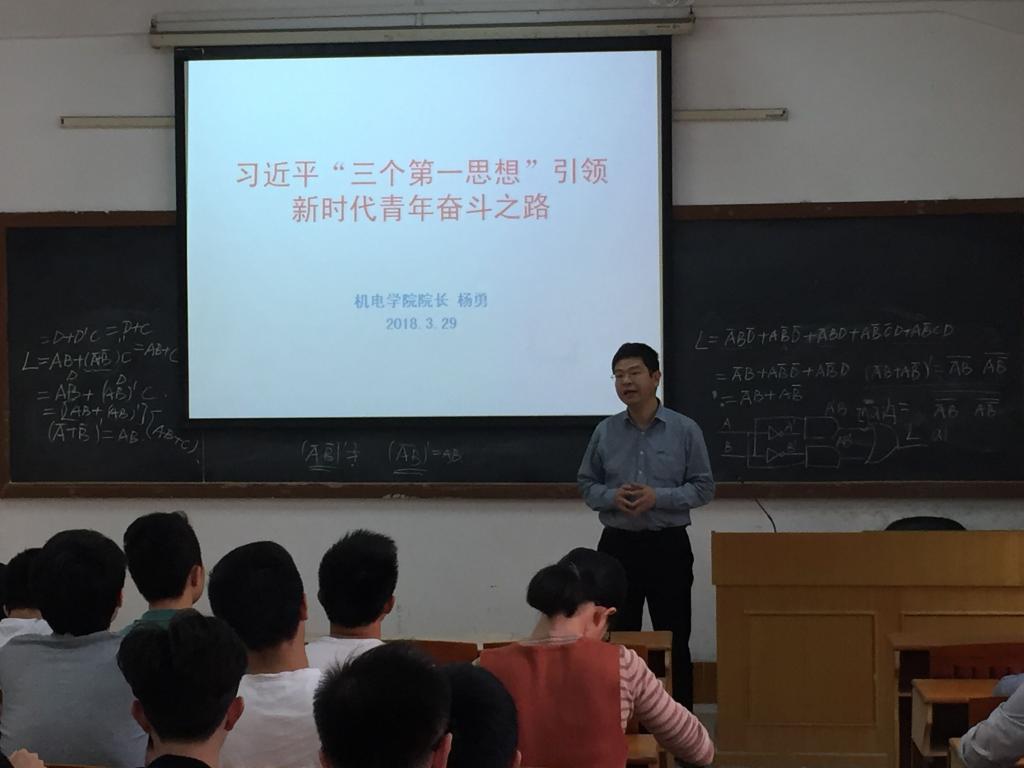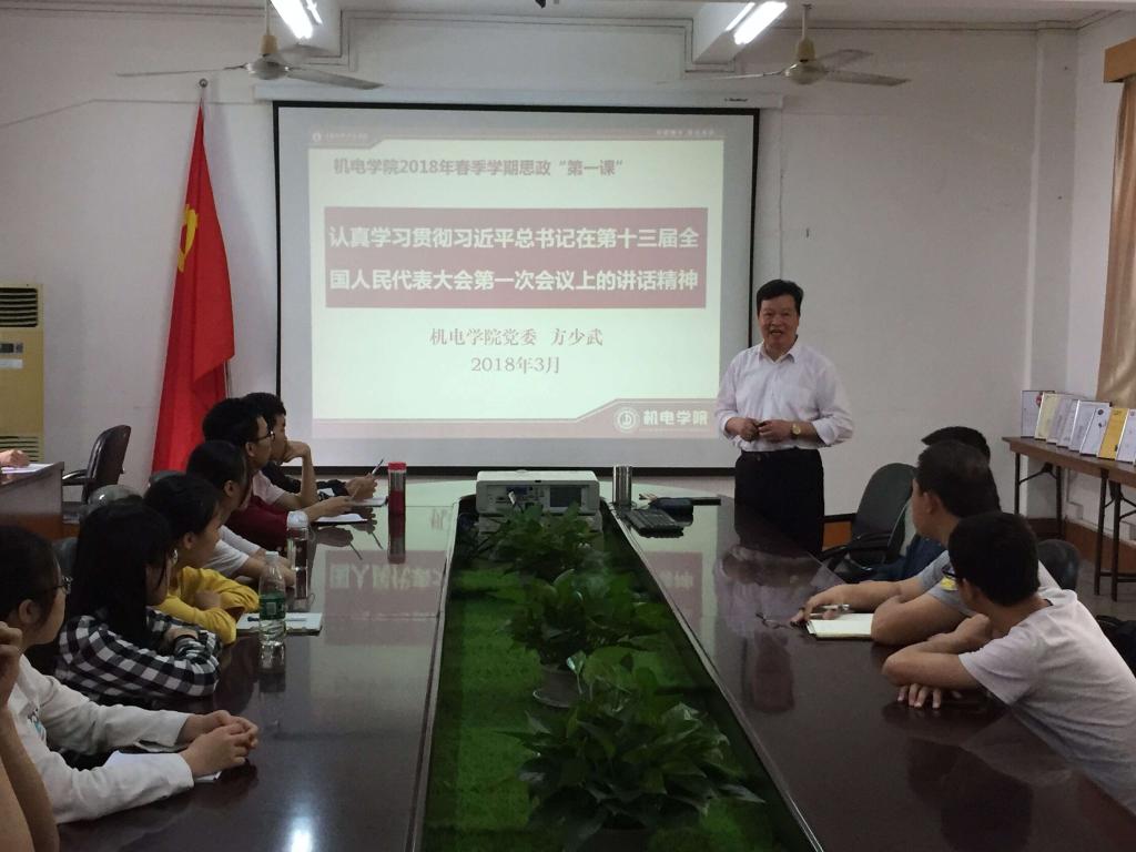 根据 《关于做好2018年春季学期党委书记、校长和二级学院党组织书记、院长上第一堂思想政治理论课工作的通知》(广师党办〔2018〕6号)要求,为贯彻落实全国、全省高校思想政治工作会议精神,落实我省高校思想政治工作制度,3月29日、30日,我院党委负责人方少武同志、院长杨勇教授分别为机电学院学生上新学期第一堂思想政治理论课(简称“第一课”)。