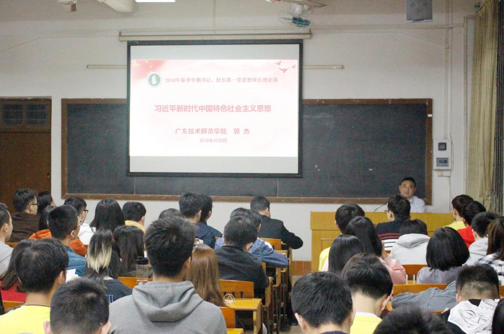 为贯彻落实《中共中央、国务院关于加强和改进新形势下高校思想政治工作的意见》和《中共广东省委、广东省人民政府关于加强和改进新形势下高校思想政治工作的实施意见》精神,4月8日晚上,学院院长郭杰在西校区综合楼媒七课室为机电学院学生上第一堂思想政治理论课,学院团委、学生工作部和机电学院的党政主要负责人,以及机电学院部分师生一同听课。
