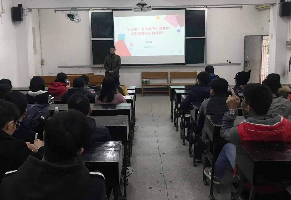 为加强我院职教师资本科生及职教方向教育专业硕士的培养,密切我院与教育实习基地黄埔职业技术学校在人才培养方面的合作。2018年12月13日,在西校区多媒体2室,黄埔职业技术学校陈民聪副校长应邀为我院职教师资本科生及研究生作了题为“如何做一名卓越的的中职教师及职校教师招聘流程”的专题讲座。本次讲座由姚屏副院长主持。
