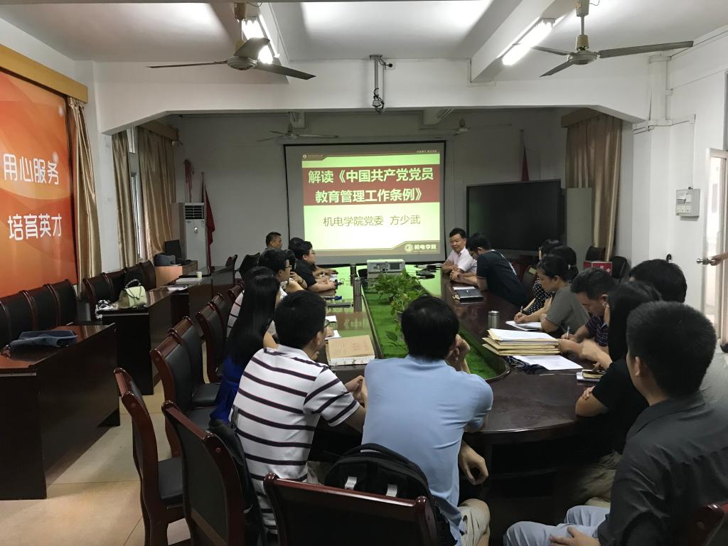为深入学习贯彻落实好《中国共产党党员教育管理工作条例》,加强基层党组织建设和党员教育管理工作,7月11日下午,机电学院党委召开全体老师党员大会,认真组织党员学习条例内容和有关精神。会上,党委负责人方少武书记为大家上了解读《中国共产党党员教育管理工作条例》的党课,从《条例》出台的背景和意义、党员教育管理工作的原则、学习贯彻习近平新时代中国特色社会主义思想、党员教育的基本任务、党员日常教育管理主要方式、党籍和党员组织关系管理、党员监督和组织处置、流动党员管理、党员教育管理信息化、组织领导和工作保障等十个方面作了全面的解读。