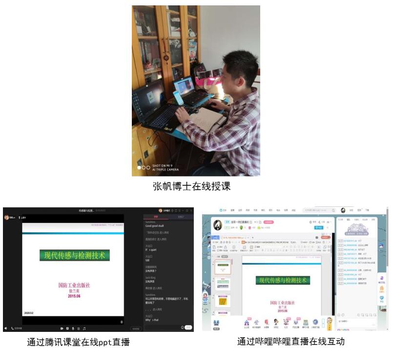 张帆老师通过哔哩哔哩直播以及腾讯课堂软件在线讲解《传感器与检测技术》,为避免线上授课高峰期因网络异常、平台拥挤等原因影响教学,采取了文字、视频和语音多种技术手段,线下提前发布教案、教学课件(PPT)、教学讲义、电子教材、课程音视频等多种方式确保即使掉线,学生也能自学。张老师表示,因为没有教材,学生只能看出版社的在线电子文档格式的教材,对提前熟悉教学内容有影响,但是学生可以通过多媒体教学实用电脑和网络,有助于学生及时查阅资料帮助理解知识点。另外之前的课堂教学计划不能很好适应在线互动式的教学,需要调整改进进度。