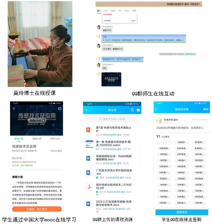 莫玲老师的《传感器与检测技术》选用的是爱课程(中国大学MOOC)、QQ群和超星学习通等平台进行在线教学。课程选用了哈尔滨工业大学张晓琳老师的《传感技术及应用》慕课视频,通过QQ群方式实时开展线上教学过程开展和在线讨论、辅导答疑、作业布置、作业截图抽查等。与此同时,莫玲老师提前录制了PPT音频文件,供学生根据需要选取学习,课后发放对应章节课件PPT和布置作业题,驱动学生带着问题主动学习和巩固。课堂气氛活跃,学生发挥自觉性,积极主动开展在线课程学习,积极发言和回答问题。