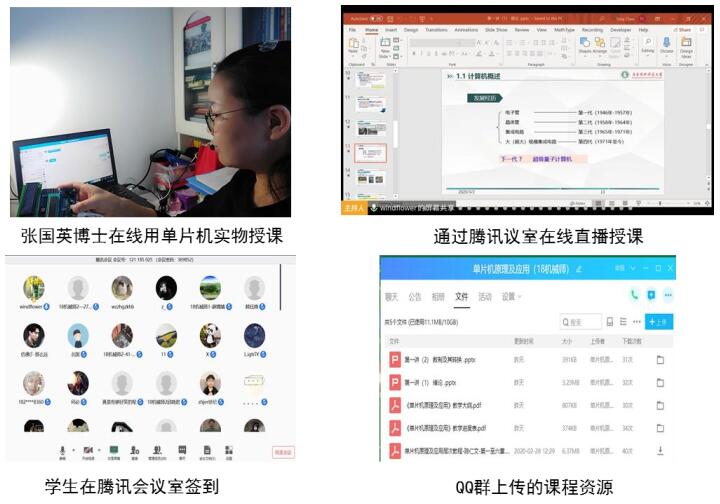 张国英老师的《单片机原理及应用》所使用的教学平台是腾讯QQ群以及腾讯会议。课前,张老师已经将教学大纲(含教学要求、考核方式)、教学课件(PPT)、电子教材、作业、参考资料等上传到群文件里。使得同学能够根据课前布置的预习任务和作业题,带着问题主动自学。为避免线上授课高峰期因网络异常、平台拥挤等原因影响教学,采取在学习通上重新录播课程,方便学生回看。课上,张老师通过腾讯网络视频会议、QQ等方式开展线上教学和在线讨论、辅导答疑、作业布置、作业检查、考核评价。上课期间课堂活跃,学生积极发言。