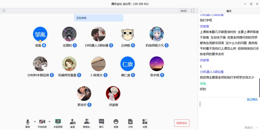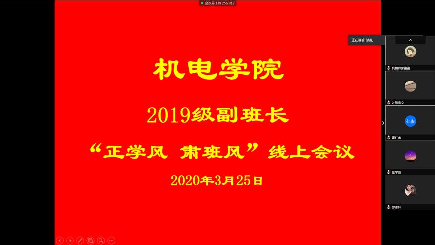 在线教学开展以来,机电学院深入贯彻“教师不停教、学生不停学”的总体要求。为确保疫情期间学院在线教学工作有序开展,进一步加强学生学风与班风建设,3月25日,机电学院学院辅导员谢仁崇老师、兼职辅导员邹胤老师召开了2019级“正学风、肃班风”副班长线上会议。2019级全体副班长参加会议。会议由邹胤老师主持。