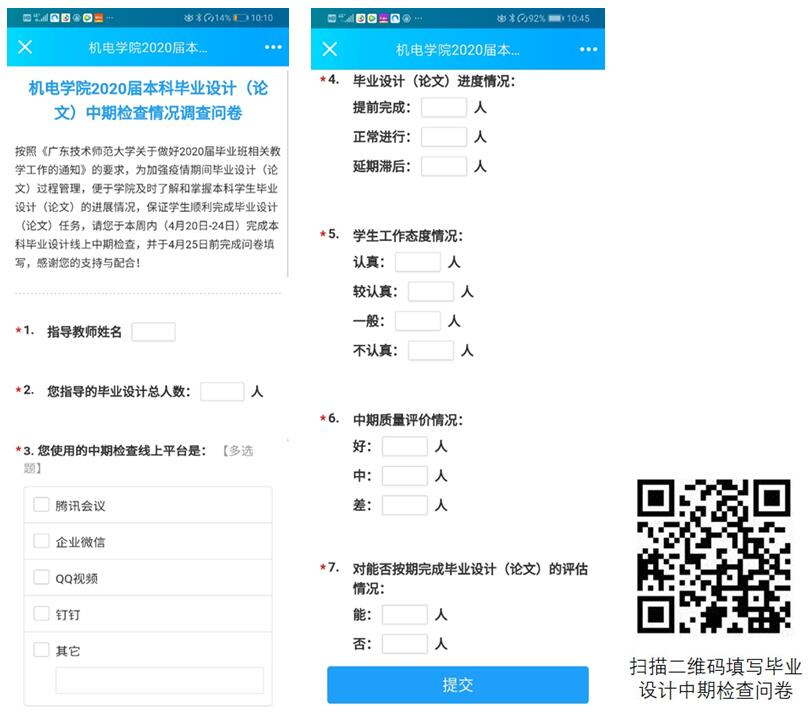 4.为加强疫情期间毕业设计过程管理,便于学院及时了解和掌握学生毕业设计的进展情况,学院设计了毕业设计中期检查网络调查问卷,对于学生毕业设计的态度是否认真、是否按计划进行、中期质量评价、能否按期完成等情况进行问卷调查,并针对问卷调查中目前进度缓慢的学生进行了重点检查,提醒了指导教师要加强指导,督促加快工作进度。