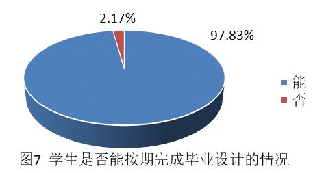 5.从图7学生是否能按期完成毕业设计的统计情况可知,导师评价97.83%的学生可以按期完成,有2.17%的学生导师认为如果不纠正前期的工作态度不认真、进度缓慢的工作状况,则有可能无法按期完成毕业设计。