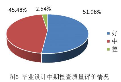 4.从图6学生完成毕业设计的中期检查质量评价情况可知,51.98%的学生质量好,45.48%的学生质量一般仅有2.54%的学生质量差,其原因主要是态度不认真,进度滞后。