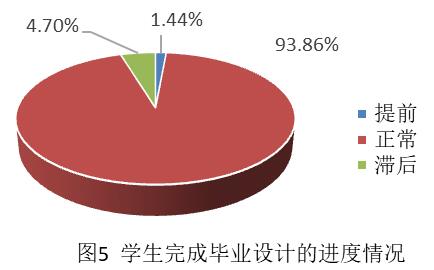 3.从图5学生完成毕业设计的进度情况可知,93.86%的学生进度正常,1.44%的学生进度超前,但仍有4.7%的学生进度滞后,已提醒导师对进度缓慢的学生加强指导,及时找到问题存在的原因,并及时解决。