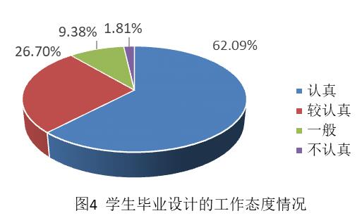 2.从图4学生进行毕业设计的工作态度情况可知,62.09%的学生认真,26.7%的学生认真,只有个别1.81%的学生不认真。对于态度不认真的学生,已提醒导师加强对学生指导与督促。