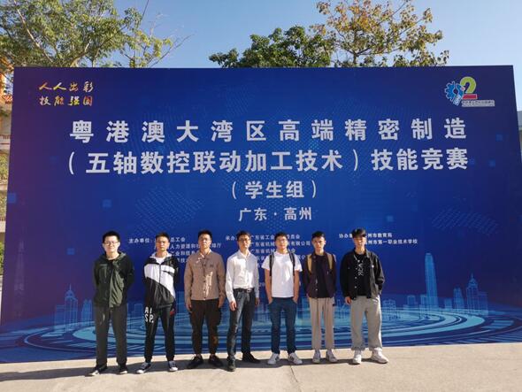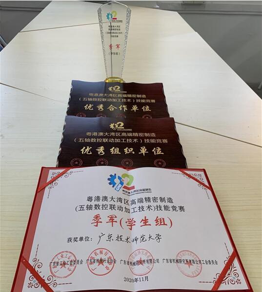 2020年11月12日至16日,首届粤港澳大湾区高端精密制造(五轴数控联动加工技术)技能竞赛在高州市第一职业技术学校举行。机电学院代表队获得学生组团体第三名的好成绩,朱荣泉同学获得二等奖,邹润开、陈昌达、郑时烽、邵永烽等四位同学获得三等奖(领队:杨勇,教练:范德鹏,刘大维),我校捧得季军奖杯。同时,主办单位授予广东技术师范大学“优秀组织单位”和“优秀合作单位”牌匾。