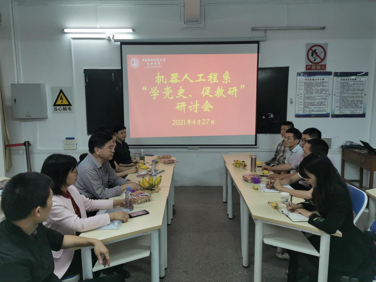 为深入开展党史学习教育,以实际行动践行“学党史、悟原理、办实事、开新局”,切实与时俱进增强新工科专业教师整体教学科研能力,4月27日下午,机器人工程系在教学楼104组织召开了一次内容丰富的教研活动,重点就党史学习教育心得体会、机器人学科专业师资队伍建设、创新班学生培养、国家自然科学基金申报经验、产学研合作开发经验,以及教学创新设计等进行了深入研讨交流。研讨会取得圆满成功,各位老师都感到收获很大,期待这种良好的教研氛围能得到长期的坚持,对进一步提升机器人工程系专业教师的教学科研能力和水平,不忘育人初心使命,关心关爱学生成长,实现机器人工程系党建与业务发展双融双促,更好地服务学校做大做强的发展战略,具有较好的现实意义。