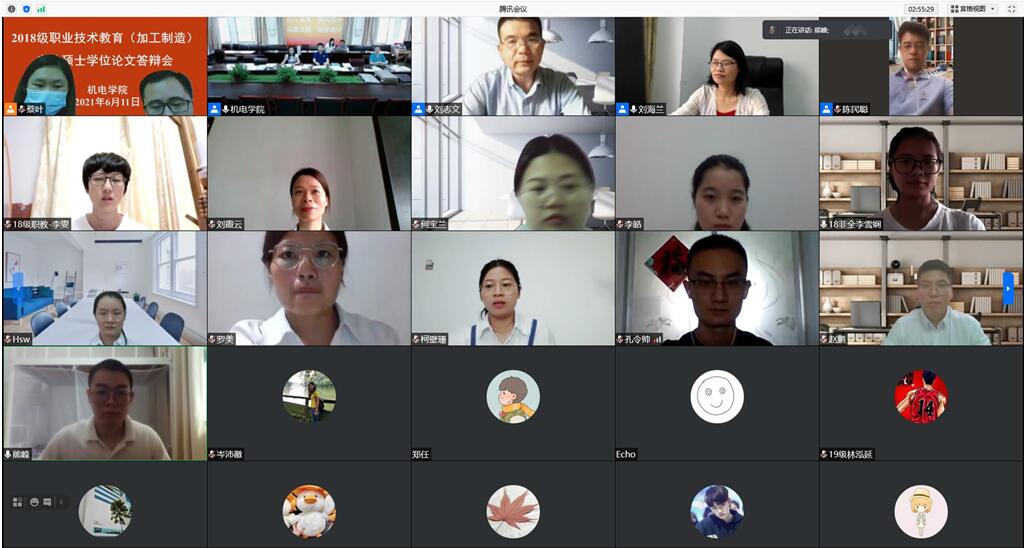 为确保2018级硕士研究生学位论文答辩及学位授予工作顺利进行,根据学校《广东技术师范大学硕士学位授予工作细则》和《关于组织2021年上半年硕士学位论文答辩及学位审核工作的通知》等文件精神,并结合疫情防控工作需要,机电学院于6月11日,在西校区综合楼405以线上方式召开了2018级共11位硕士研究生的学位论文答辩会。本次答辩委员会主席由华南师范大学教育科学学院院长、博士生导师刘志文教授担任,其他答辩委员会委员分别为广州市黄埔职业技术学校副校长陈民聪高级教师,我校职业教育教师学院副院长刘海兰教授,以及机电学院院长杨勇教授、副院长徐兰英教授和王敏副教授。学院党委书记陈郁芬出席了答辩会,部分硕士生导师、2019级和2020级硕士研究生通过线上方式旁听了答辩会。