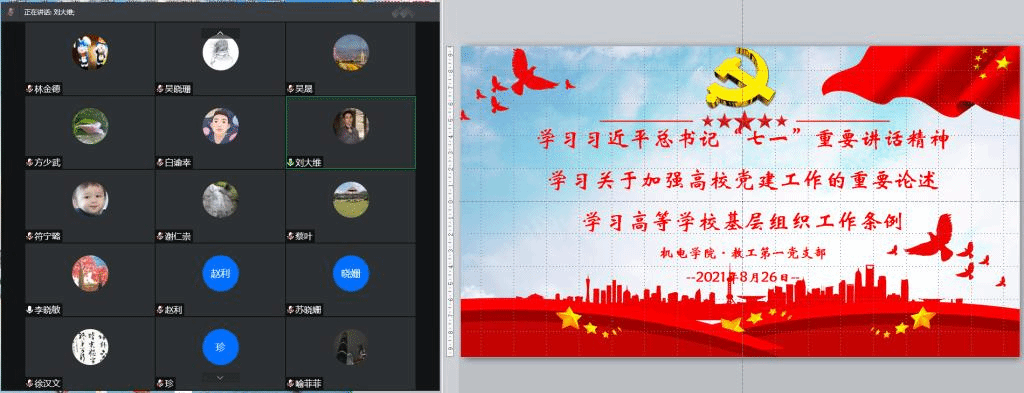 为响应学校、学院党委关于深入学习贯彻习近平总书记“七一”重要讲话精神和关于加强高校党建工作的重要论述,贯彻落实《中国共产党普通高等学校基层组织工作条例》的要求,确保师生党员在暑假期间保持学习不放松、不掉线,机电学院各党支部结合工作实际,于8月中下旬通过观看影片、集体讨论等方式开展了线上专题学习。