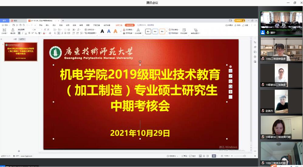 为进一步提高研究生培养质量,按照学校研究生院工作要求和部署,机电学院于10月29日上午,在西校区综合楼405会议室,通过线上线下结合的方式,举行了2019级16名专业学位研究生的中期考核。中期考核小组组长由华南师范大学陈先哲教授担任,广州市轻工职业学校周伟贤校长、机电学院杨勇教授、徐兰英教授、王敏副教授、张帆高级工程师为中期考核小组成员。学院党委书记陈郁芬出席了中期考核会,2020级、2021级硕士研究生和部分研究生导师参加了旁听。