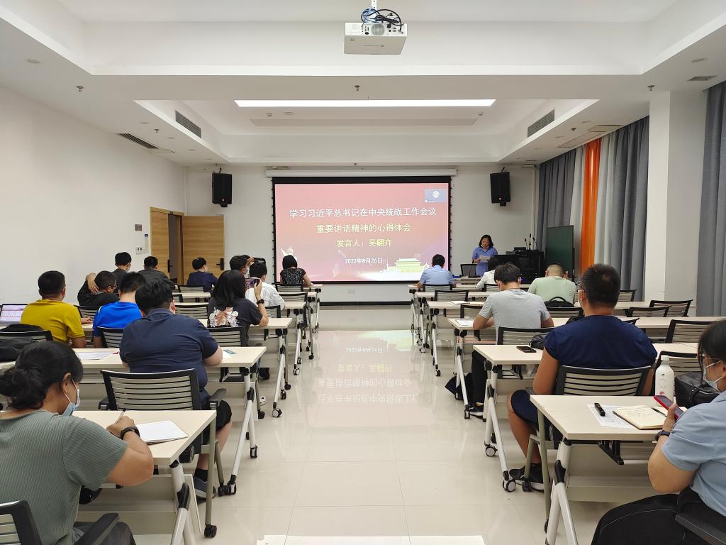 机电系吴翩卉老师就学习习近平总书记在中央统战工作会议重要讲话精神谈了学习体会。习近平总书记的讲话里强调“促进中华儿女大团结,是新时代爱国统一战线的历史责任”。作为青年教师,要通过“课堂+”的方式,将高校青年爱国主义统一战线主题教学的内容嵌入到课堂中,做到协同教学。她分享了自己在国外留学时期的所见所想,强调教育是一个系统的工程,希望将所学知识结合学生特点和企业需求,让教育和教学覆盖面更广,让更多青年掌握更多高科技的技术。