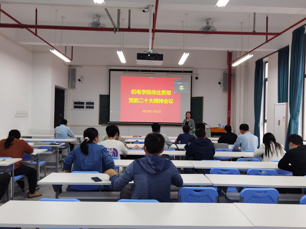 11月2日,机电学院以线上线下相结合的方式召开会议传达学习贯彻党的二十大精神,对我院学习宣传贯彻党的二十大精神进行全面动员部署。会议在白云校区4号实训楼202室设主会场,西校区实训楼104室设分会场。机电学院全体党政领导、全体党支部书记、系(中心)负责人与全体教职工参加会议,会议由党委书记陈郁芬主持。