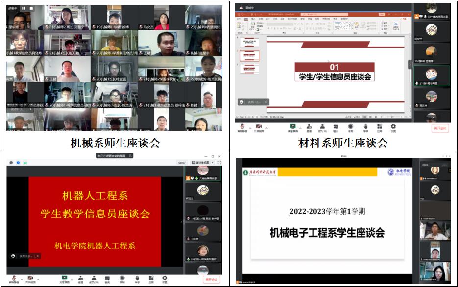 按照教务处“关于开展2022-2023学年第一学期期中教学检查工作的通知”要求,为持续加强本科教学过程监控与管理,确保本科教学高质量运行,机电学院于11月23日下午分别通过腾讯会议线上召开了各系期中教学检查学生座谈会、教学信息员座谈会、教师座谈会、教学研讨会。会议由各系主任主持,全体专业课教师、辅导员、实验中心教师、2019-2022级各班班长、学委、教学信息员参加了会议。