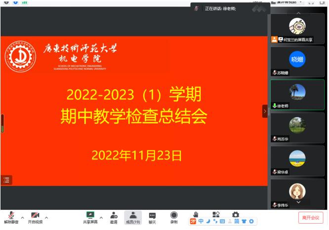 会后,机电学院召开了2022-2023(1)学期期中教学检查总结会,机电学院领导班子、各系主任、院级督导、实验室中心主任及部分教师代表参与了此次会议,会议由徐兰英副院长主持。总结会上,各位系主任依次汇报了各系师生座谈会和教学研讨会的情况,逐一反馈师生提出的问题,如线上教学质量难以把控,部分学生存在挂机现象等;学院督导高吉祥教授和肖苏华教授分别针对本学期听课评课工作发现的问题,如年轻教师授课效果欠佳,提出了相应的解决途径。肖教授建议线上的上机操作课程,学生可通过群接龙提交作品,加强对学生上机情况的监控。