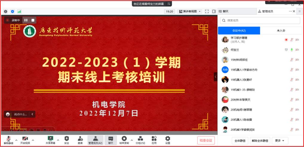 12月7日晚上,教务员苏晓姗、符宁璐、何宝兰老师给各班同学进行期末线上考核培训会,会上,何宝兰老师给同学们详细讲解了超星智慧考试系统学生使用方法、“腾讯会议”APP安装及考试说明等,涉及线上考核准备、考核流程、注意事项、拍照作答指引、线上模拟测试流程等方面内容。会后,各教务员逐一解答了同学们的常见问题,如考核证件不齐、不具备线上考核条件等。对于不具备线上考核条件的学生,情况核实后再申请办理缓考。