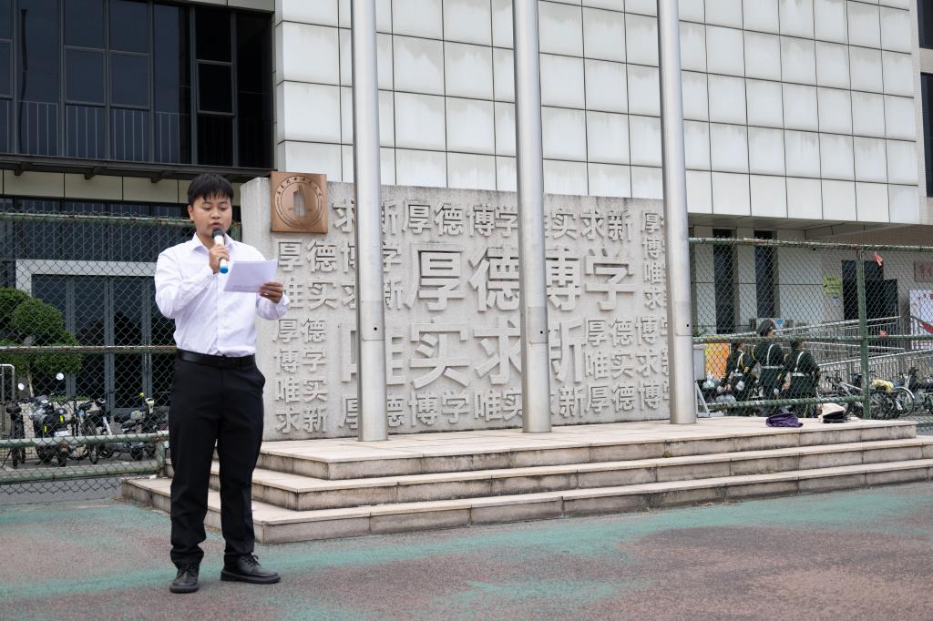 上午7:00,《义勇军进行曲》的旋律响起,护旗手挥臂展旗,五星红旗在晨光中缓缓升起,现场全体人员行注目礼,齐声高唱国歌,嘹亮的歌声响彻运动场。升旗仪式结束后,学生代表黄清瑜发表演讲。他以“青春之我,铸强国之器”为主题发言。他铭记习近平总书记对青年“立大志、明大德、成大才、担大任”的要求,认为专业知识是“铸器”基础,人文与家国情怀是“灵魂”。作为国家奖学金获得者,他呼吁同学们,珍惜时光、夯实基础、勇于创新,将个人成长融入国家发展,以青春智慧铸时代“强国之器”。